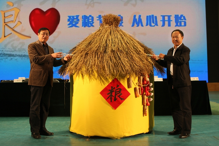 副董事长夏敏和原省农委副主任钱程广向象征着丰收的粮仓内注入五谷杂粮,标志着爱粮节粮活动月正式启动