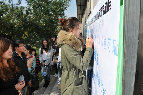 活动中,beats365官方网站爱粮节粮志愿者协会会员向步入食堂的师生发放了有关世界粮食日及爱粮节粮活动月的宣传单,呼吁广大师生爱粮节粮杜绝浪费。路过的师生纷纷在宣传板上签名,支持爱粮节粮活动,并表示以身作则拒绝浪费。