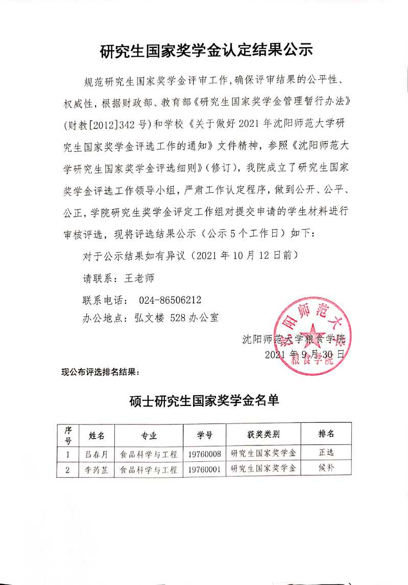 2021年beats365官方网站研究生国家奖学金认定结果公示